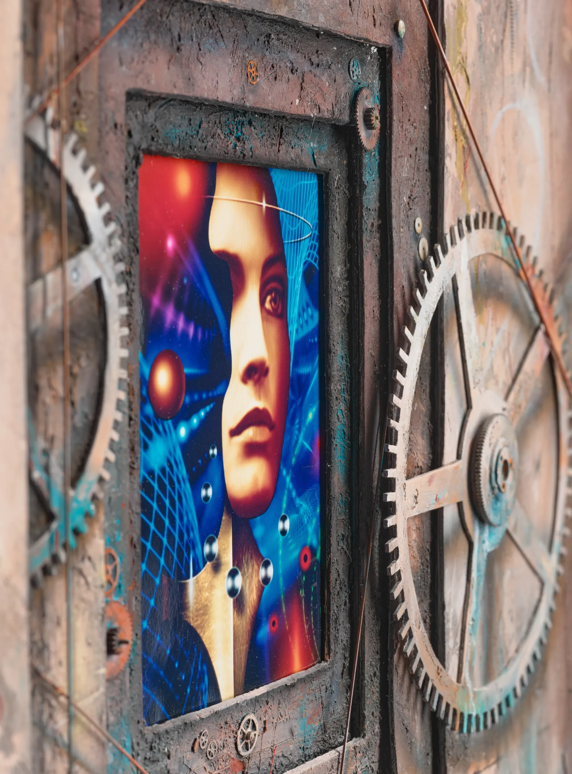 The present artwork illustrated the dust-jacket for the first edition, and is recognisable also as the artwork selected for numerous later editions including the French and German translations. Jensen’s work brilliantly captures the novel’s fusion of dystopian futurism and neo-Victorianism, and seems to explore the question of ‘conformity or rebellion?’ which runs through Stephenson’s narrative. Its striking portrayal of a partial female face at the centre, set against a futuristic backdrop of complex geometries and offset by the rusted metallic browns of the foreground, provides an inspired combination of the post-cyberpunk and steampunk elements which define the novel. The artwork not only complements the complex narrative of The Diamond Age, but has itself become iconic, embodying the visual identity of one of the most influential works in modern science fiction.